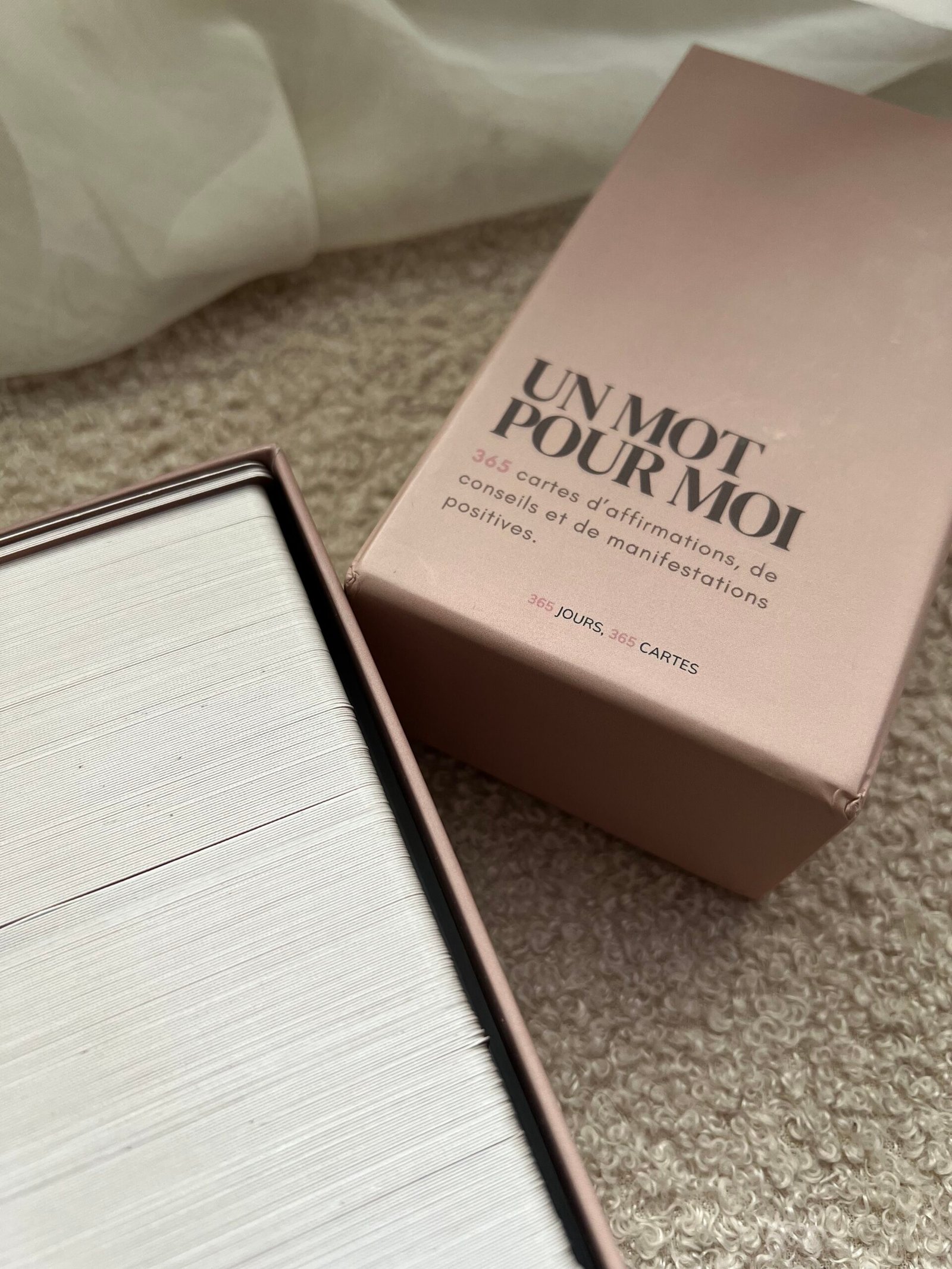 Un mot pour moi est un outil de développement personnel au quotidien. Il comporte 365 cartes de paroles inspirants – des affirmations positives, des phrases de manifestation et des conseils de vie – pensés pour vous accompagner au quotidien.